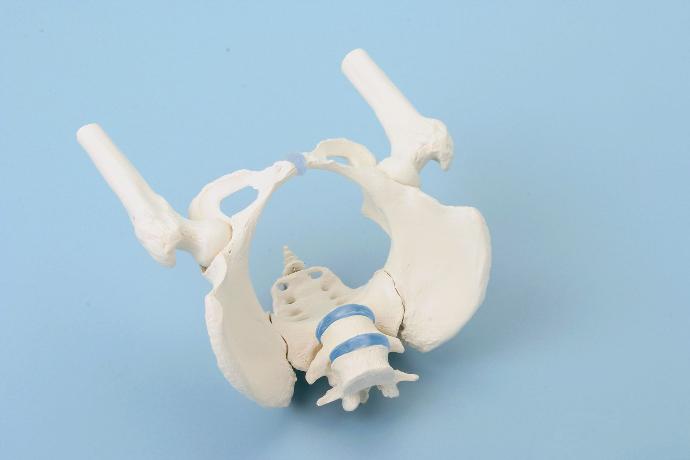 The Female Pelvis with Sacrum represents the natural imprint of the pelvis of an adult woman. The sacrum is removable, movements in the ilio-sacral joint can be demonstrated. The vertebrae are movable, the thigh pieces are movable and removable.