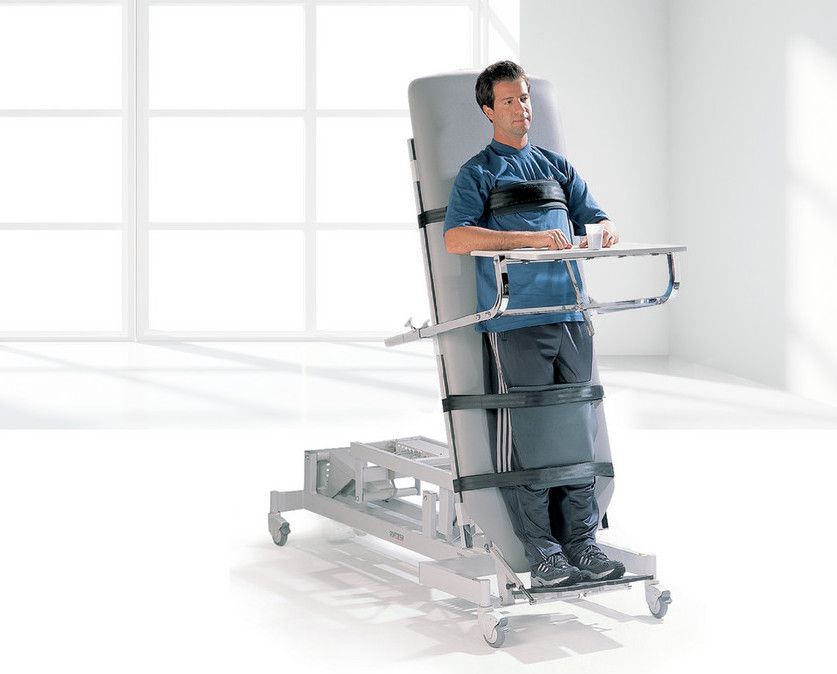 Table de verticalisation réglable en hauteur avec deux moteurs. Un moteur garantit sans effort et en douceur l'inclinaison; l'autre ajuste la hauteur et facilite transfert de patient. Le Tilting est la position idéale pour aider à la revalidation et à l'adaptation neuromotrices avec des exercices couché à debout