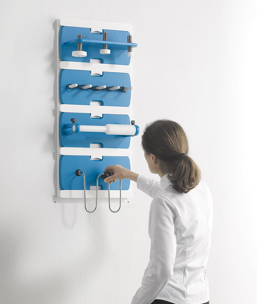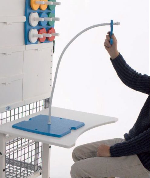 Une fois que l'aide à travailler a été identifiée, elle peut être positionnée à la bonne hauteur. La possibilité de positionner l'aide individuelle au travail plus haut apporte gradualité et progression à l'exercice, au fur et à mesure que le patient s'améliore. De plus, la même aide au travail peut être utilisée en position horizontale ou inclinée entre 0 ° et 90 °.