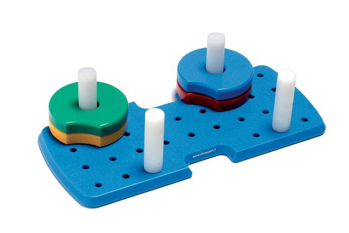 Sa taille a été conçue pour favoriser la préhension avec la main presque ouverte et l'extension des articulations métacarpo-phalangiennes et interphalangiennes. L'insertion des disques dans les broches permet de travailler la pronosupination du poignet. Incluant base à trou, quatre (4) cylindres et quatre (4) disques de couleurs différentes.