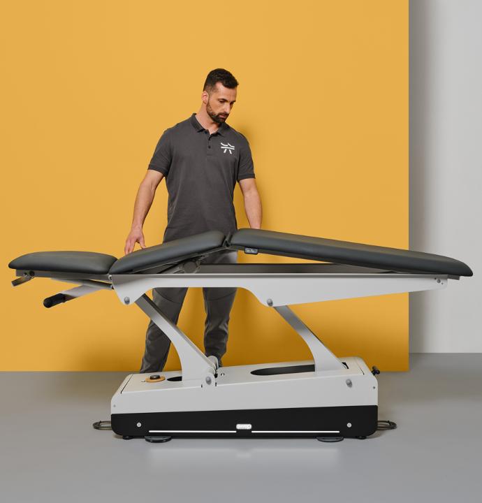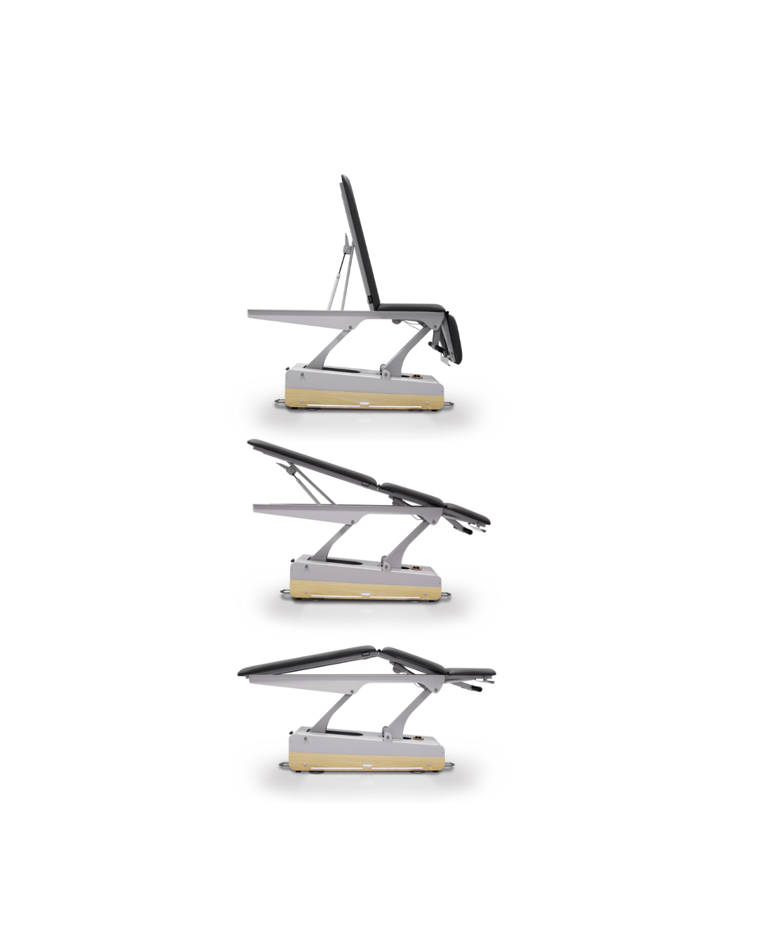 La table de traitement électrique à 3 sections Naggura Luxe permet plusieurs positions pour un confort optimal, avec 2 moteurs qui règlent la hauteur par cadre périphérique et la section centrale (position Trendelenburg et cyphose). Équipée d’un système de roues escamotables. Livré avec panneau latéral de couleur Oak (Chêne).